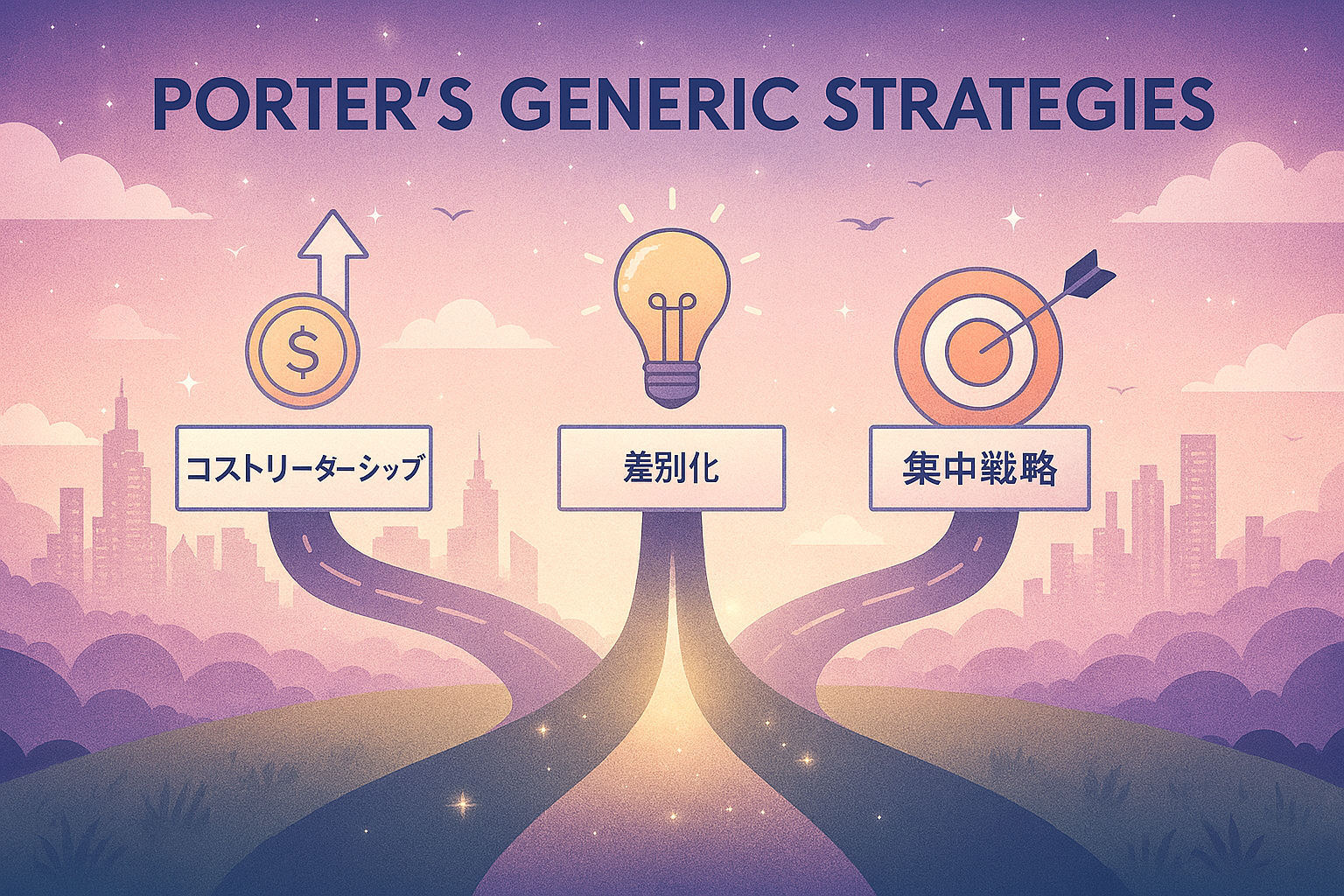 ポーターは、企業が競争優位を築くためには、以下の3つの戦略のいずれかを選択し、集中すべきだと提唱しています。